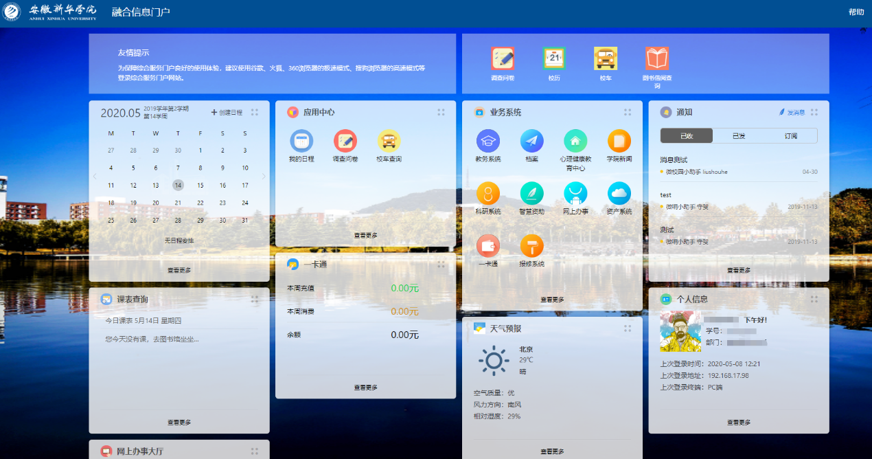 2019年,安徽新华学院携手尊龙时凯共同推进智慧校园平台建设,主要通过升级“掌上华园”移动门户、定制“最多跑一次”综合服务门户和打造数据平台这三大举措,有效地为学校信息化建设提速,助力校园信息化服务向更高质量、高效率方向的前进,更好地为学校管理和教学服务。