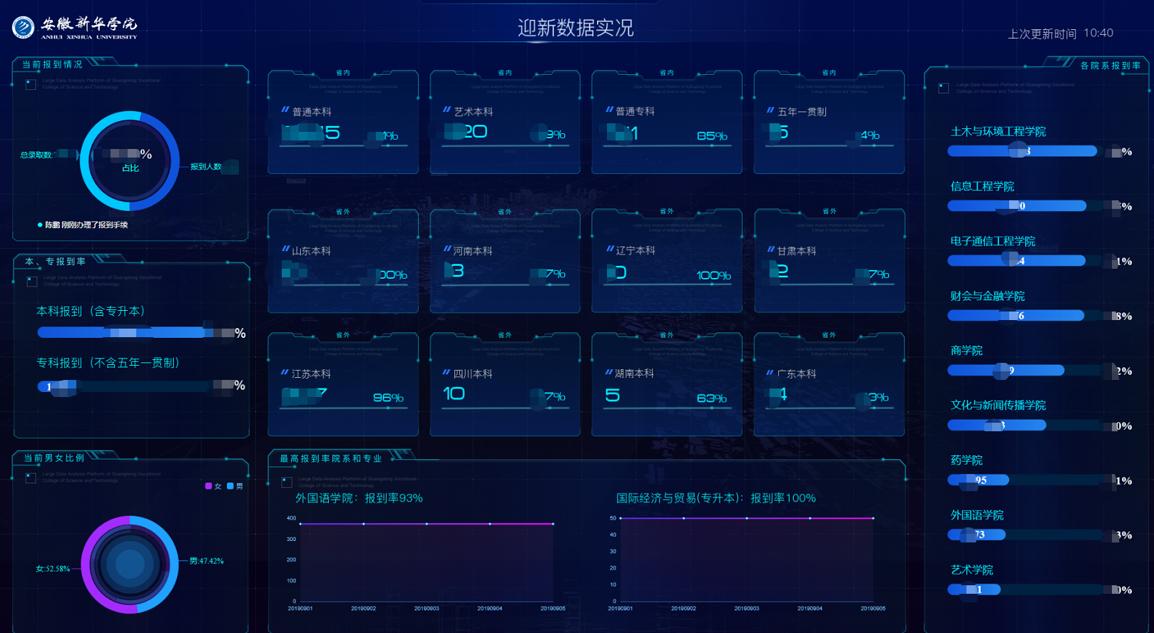此外,学校将迎新数据按照招生的地域、院系和专业等维度,以数字大屏的方式实时地将新生报到数据呈现出来,全新的数据统计方式得到校领导及各部门的高度认可。
