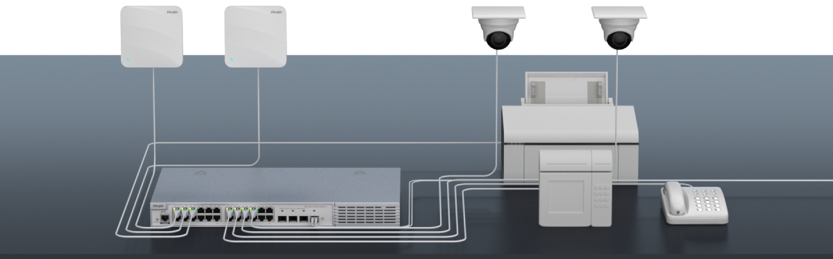 支持PoE供电的产品推荐RG-S2910-24GT4SFP-P-L、RG-S2910C-48GT2XS-P-L,单端口功率最大达30W,可以为网络电话、网络摄像头、无线AP等设备供电。